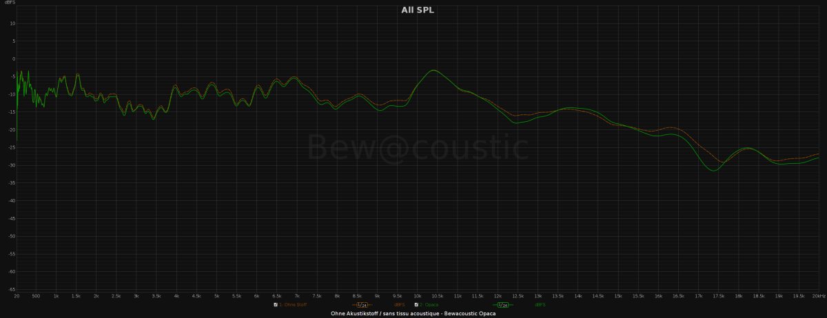Unser Premium Bespannstoff zum Beziehen von Lautsprecher-Abdeckungen, Soundpanels, Doorboards, Schallabsorber, Autolautsprecher und noch viel Anderes. Der akustisch transparente Boxenstoff vermeidet unerwünschte Klangverluste im Mittel- und Hochtonbereich (siehe Messkurve). Bei tieferen Frequenzen ist der Einfluss von Akustikstoff nicht relevant.